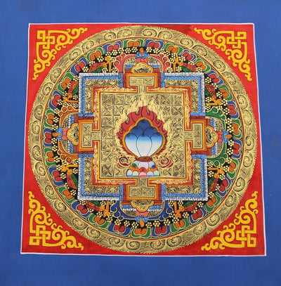 This thangka features an ethereal mandala design with bright, bold color and gold painted accents. In the center of the mandala is a Tibetan jewel design with Eternal Knot Symbols in the four corners. A Windhorse is often depicted as carrying the wish-fulfilling jewel, or the Three Jewels of Buddhism: the Buddha (teacher), the Dharma (teaching), and the Sangha (community).