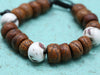 Bodhi beads that have been cut on each end, making them flat in the traditional manner are contrasted with large naga shell beads to create this beautiful bracelet. The naga shell beads are inlaid with pieces of turquoise and coral. Hang strung in Nepal with an adjustable sliding knot closure.