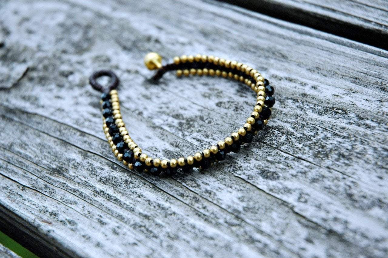 Brass beads with faceted black beads for sparkle. Clasp is a wrapped cord loop and small brass bell. Made in India.