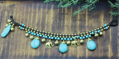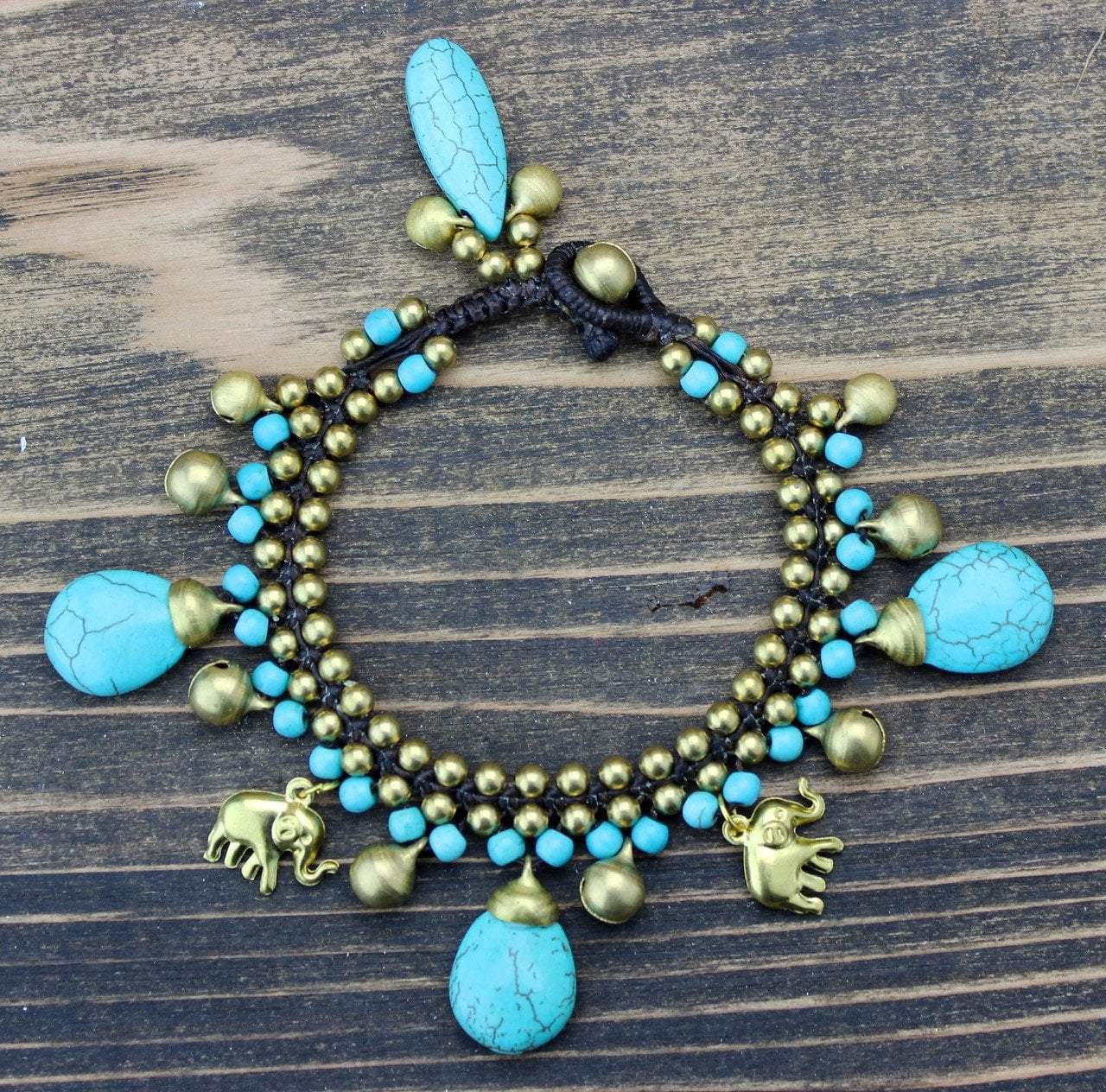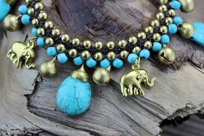Turquoise bead and brass elephant charm bracelet on wax cord.