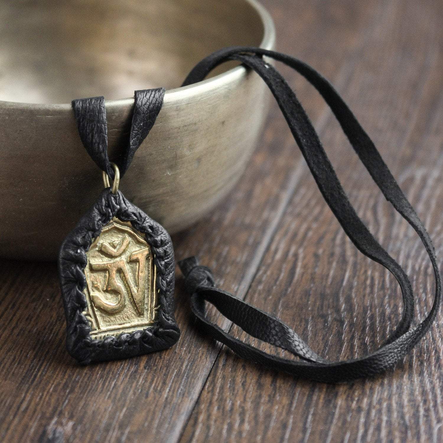 This awesome brass pendant necklace features the symbol of Om and is wrapped in leather and hand strung on leather cord. Pendant necklaces like these are very popular in Tibetan culture and can often be considered sacred.