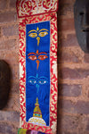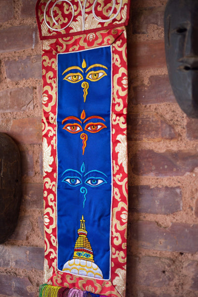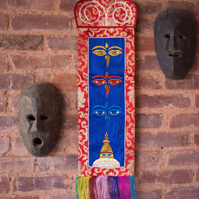 This beautiful Tibetan wall hanging features 3 sets of Buddha wisdom eyes with a stupa at the bottom. These embroidered Buddha eyes are a constant reminder of the compassion of the Buddha. They are so prevalent throughout the country that they have become a symbol of Nepal itself. Buddha's wisdom eyes, which look out in the four directions, symbolize the omniscience of a Buddha.