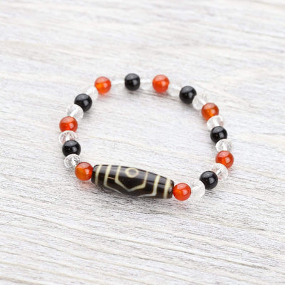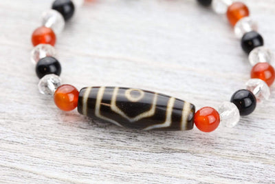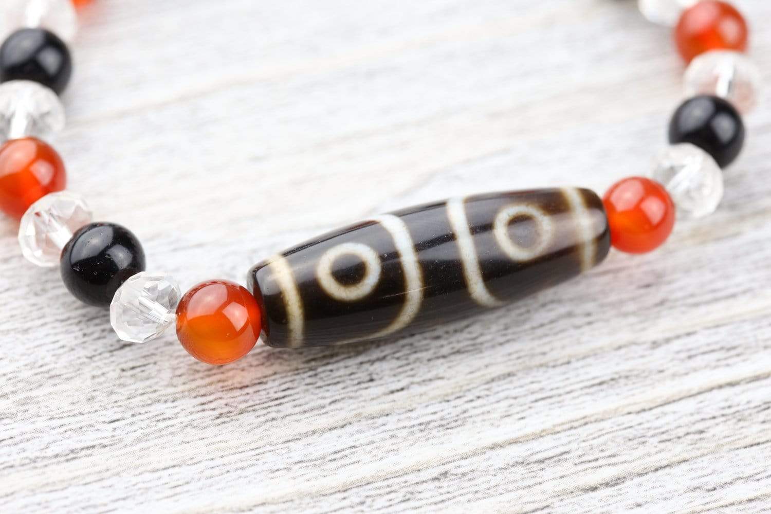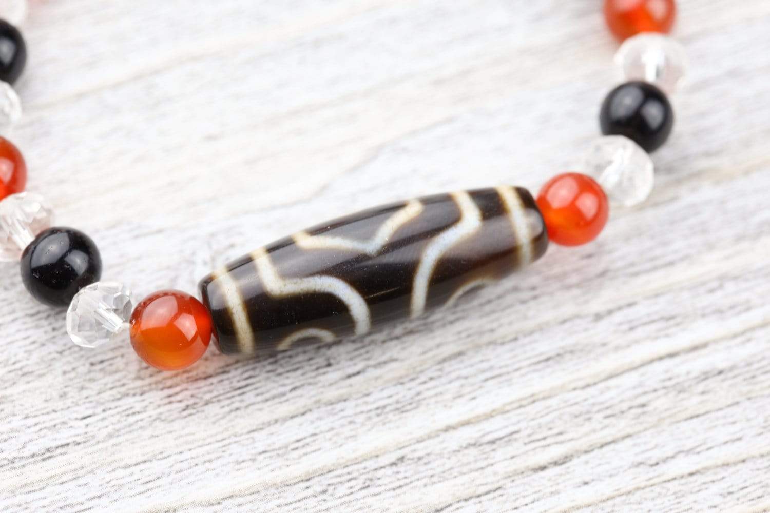 Wrist mala measures approximately 7 inches around on stretchy cord. Beads are about 8mm. Dzi bead measures just under 1.5 inches long and 0.5 inches wide. Made in Nepal.