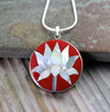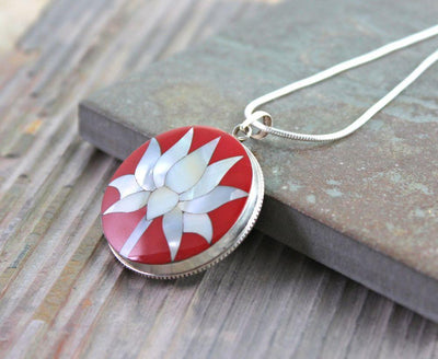 I fell in love with these pendants. Hand made of coral with delacate mother of pearl inlaid in solid sterling silver.