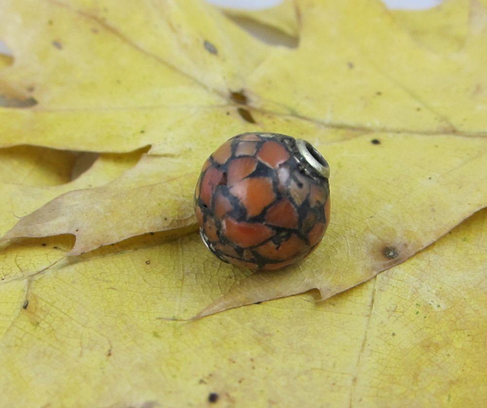 So cool, this mosaic bead is made with coral chips inlaid in sterling silver