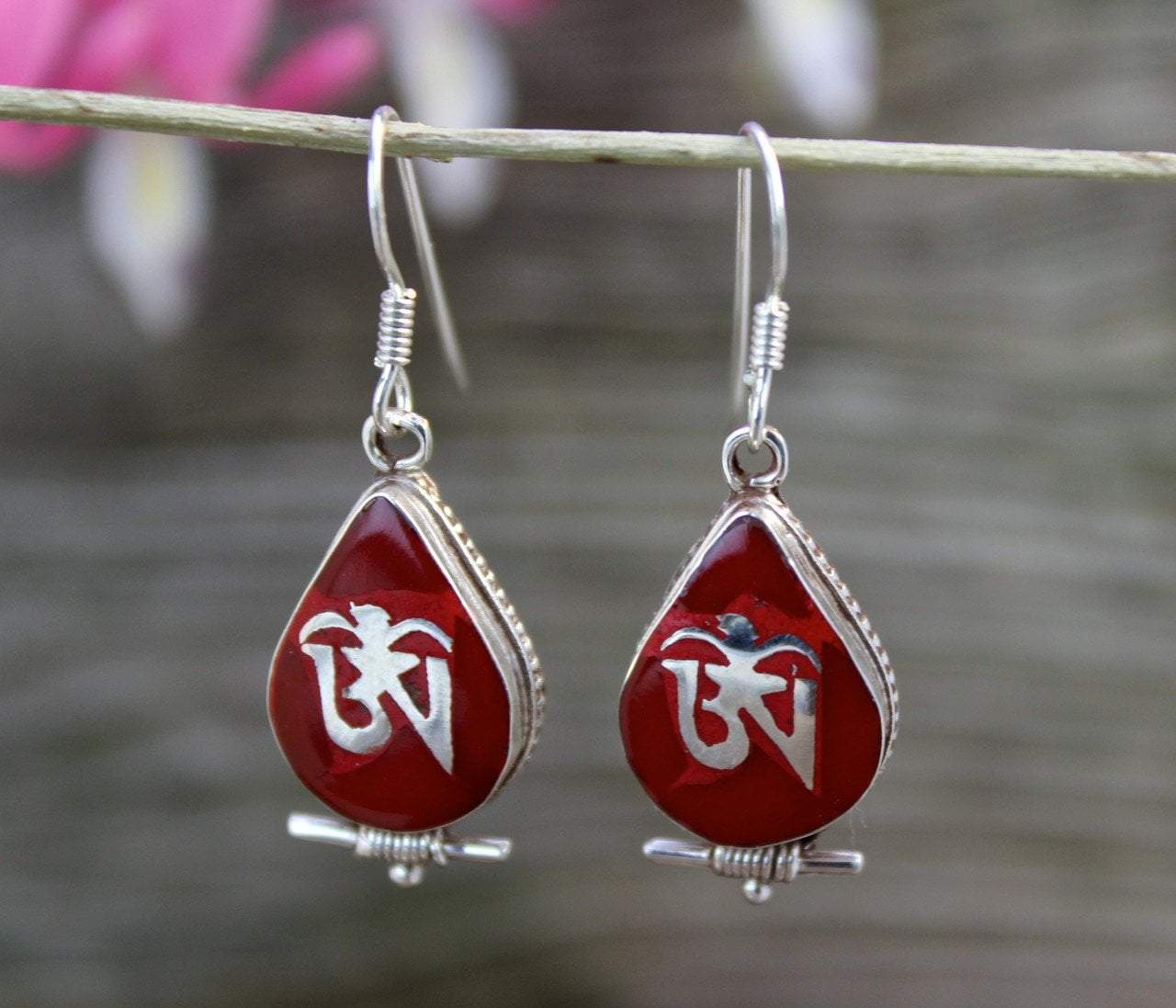 These stunning teardrop shape coral earrings are inlaid with sterling silver Tibetan Om.