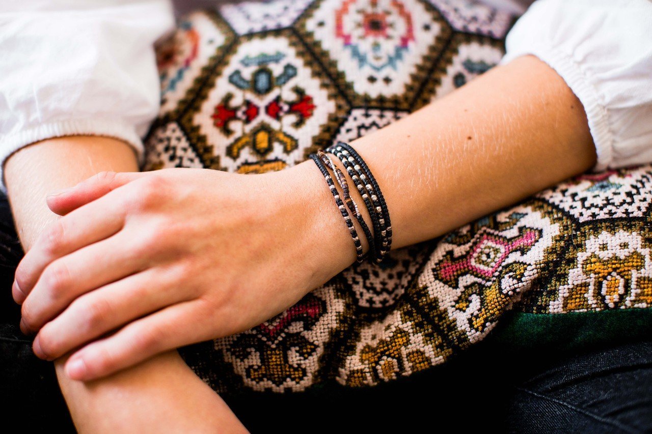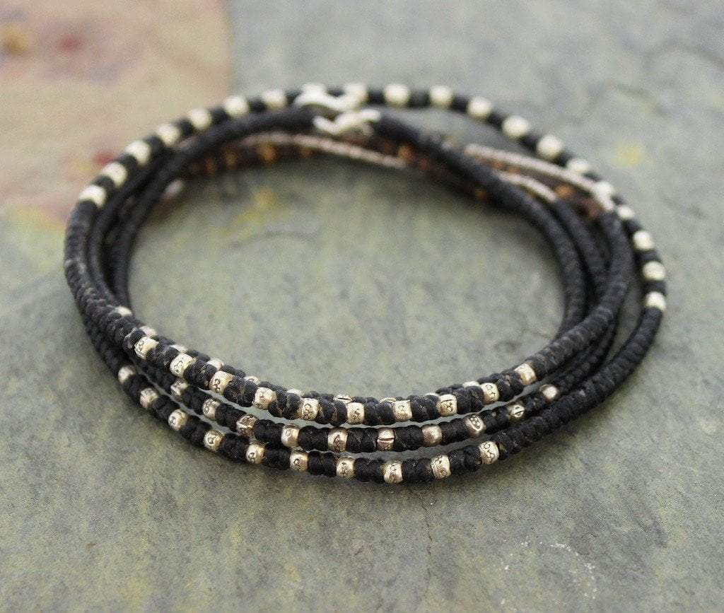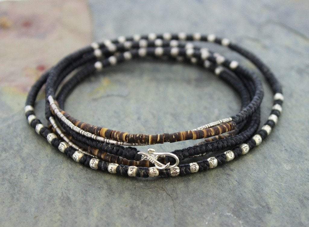 Our new handmade wrap bracelet can be used as a necklace as well. 1 30 inch strand of sterling silver, coconut shell beads and hill tribe silver spacer with a hook closure. You can add a charm or pendant, and wear it as a necklace or just wrap it 4-5 times around your wrist. My new favorite!