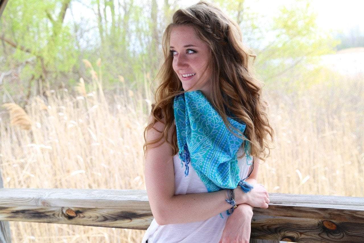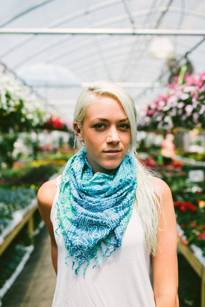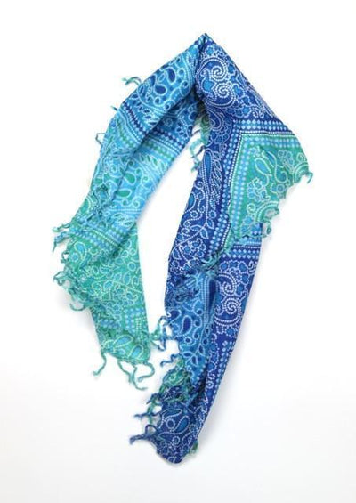 Soft and light, this handmade 100% cotton scarf has a vibrant checkerboard and paisley design. Perfect for the season! Subtle, 2 inch fringe along the edges.