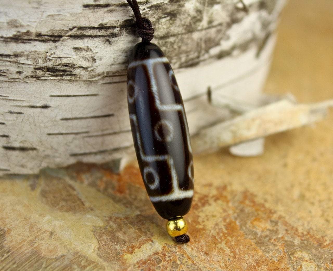 9-eyed dzi bead hung vertically on dark brown cord with a simple knot. The nine eye Dzi bead is said to promote wealth, good health, suzzess, compassion and glory.