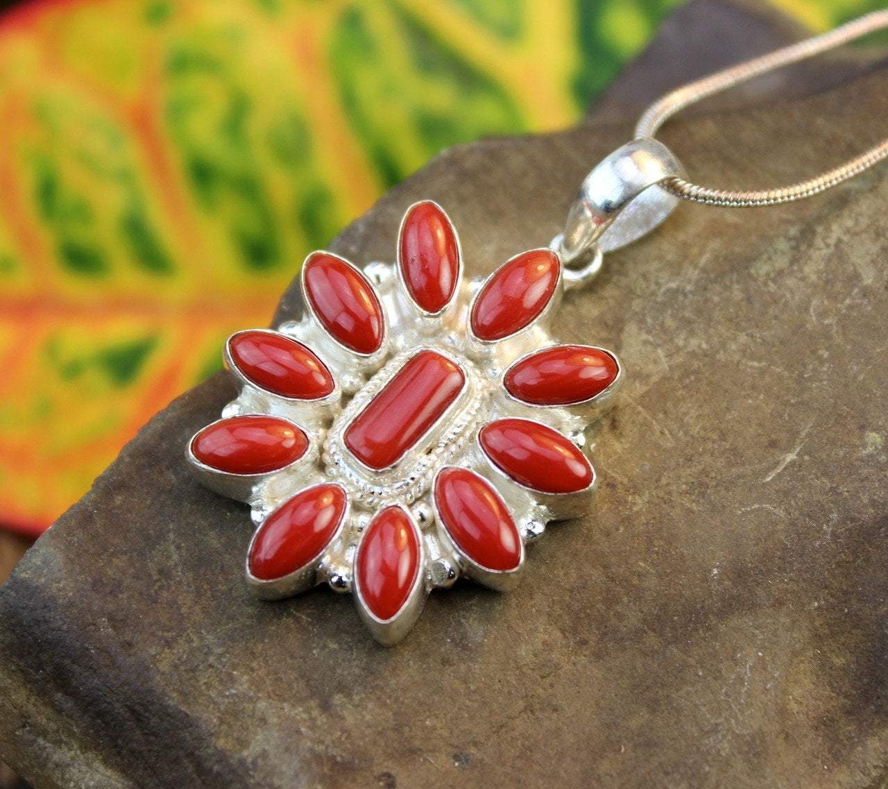 Gorgeous sterling silver pendant with coral stones. Hand made in Kathmandu, Nepal.