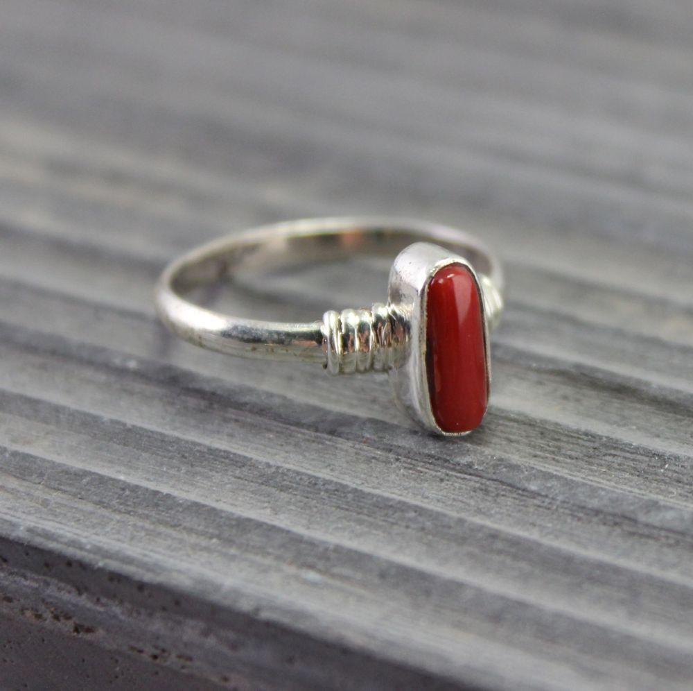 Size: 3/8 inch long coral stone. Sized ring. Limited quanitites.