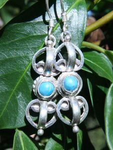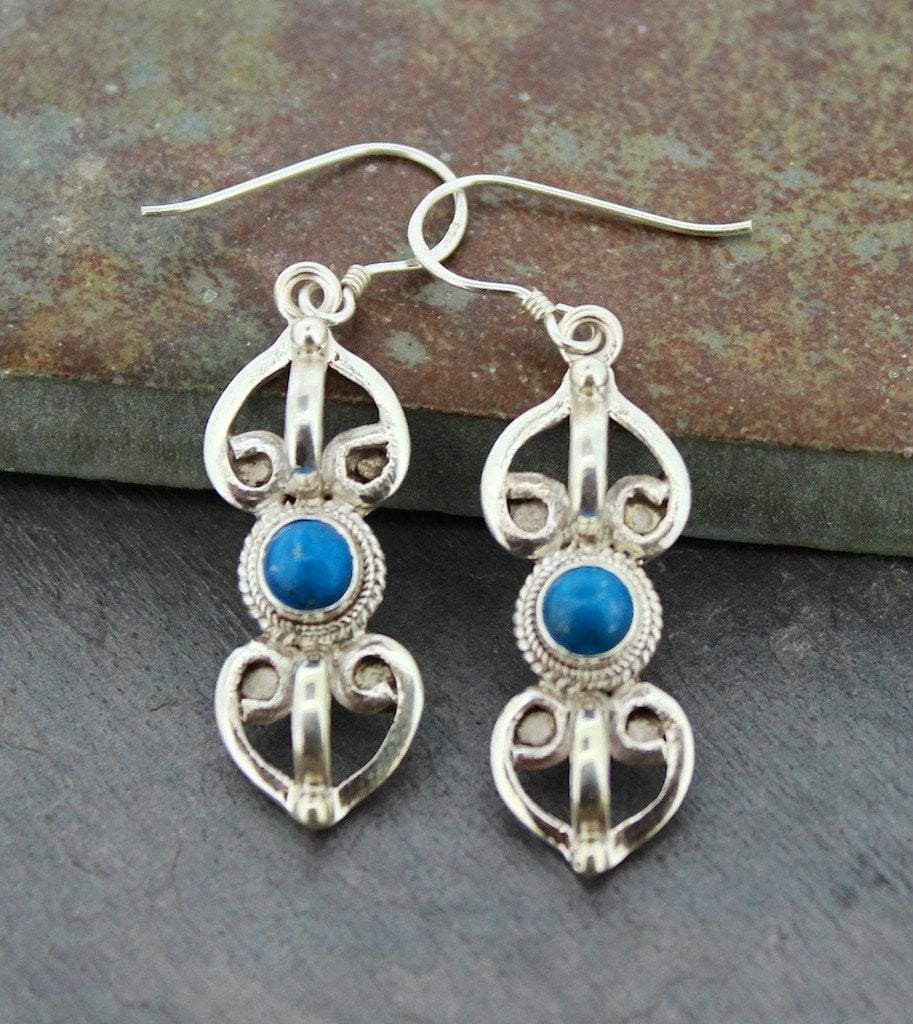 These popular sterling silver earrings are inlaid with a turquoise stone and represent one of the most powerful symbols in Buddhism. The dorje is a symbol for lightning and strength, complementing the bell.