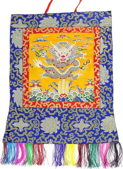 Beautiful brocade wall hanging featuring a dragon and multicolor fringe.  Perfect for your home, office, or sacred space.