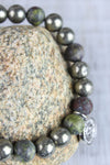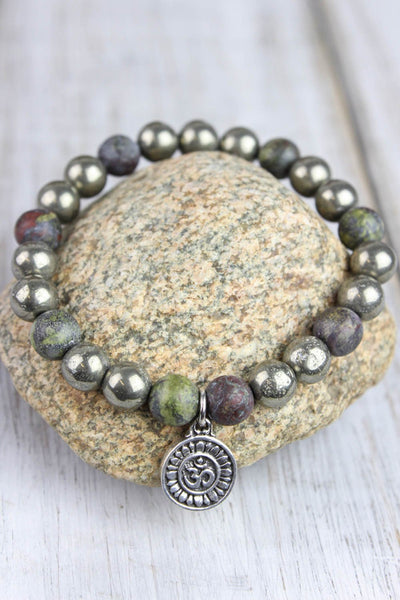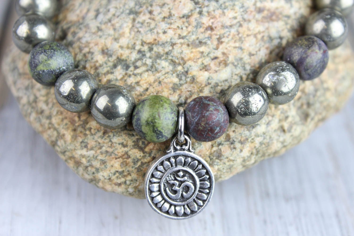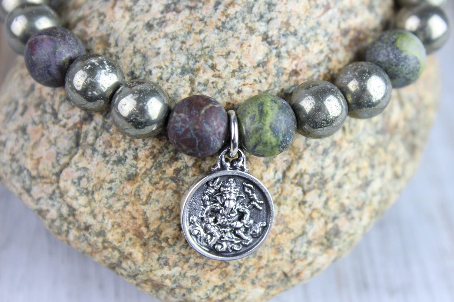 This limited edition wrist mala is designed to help harmonize your root chakra. Dragon's blood and pyrite beads are hand strung with an intricate charm, featuring Ganesh on one side and the Om symbol on the other. Pyrite is cool to the touch and contrasts nicely with the dragon blood beads.