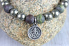 We have a very limited quantity of these! Wrist mala features 23 beads, 8mm. Charm is about 15mm tall with bale and 12mm wide. Measures approximately 6 inches around on stretchy cord and fits almost any wrist size.
