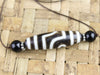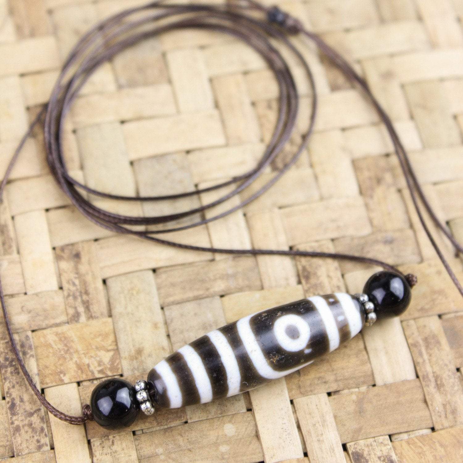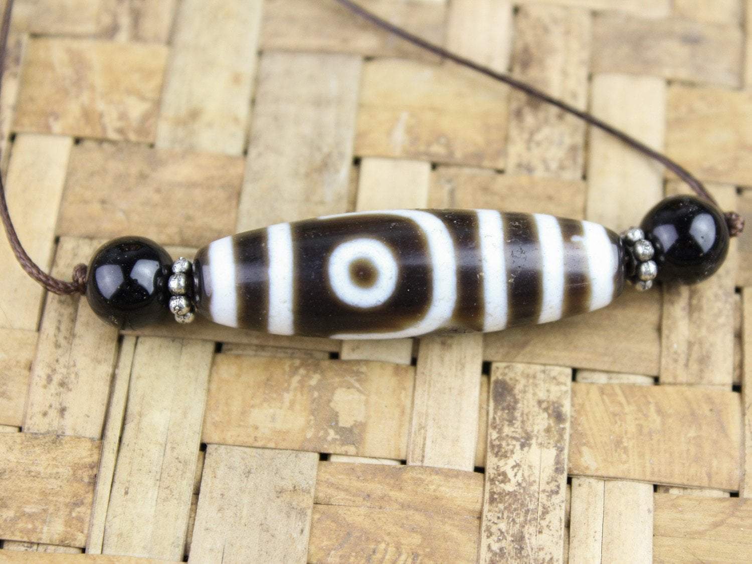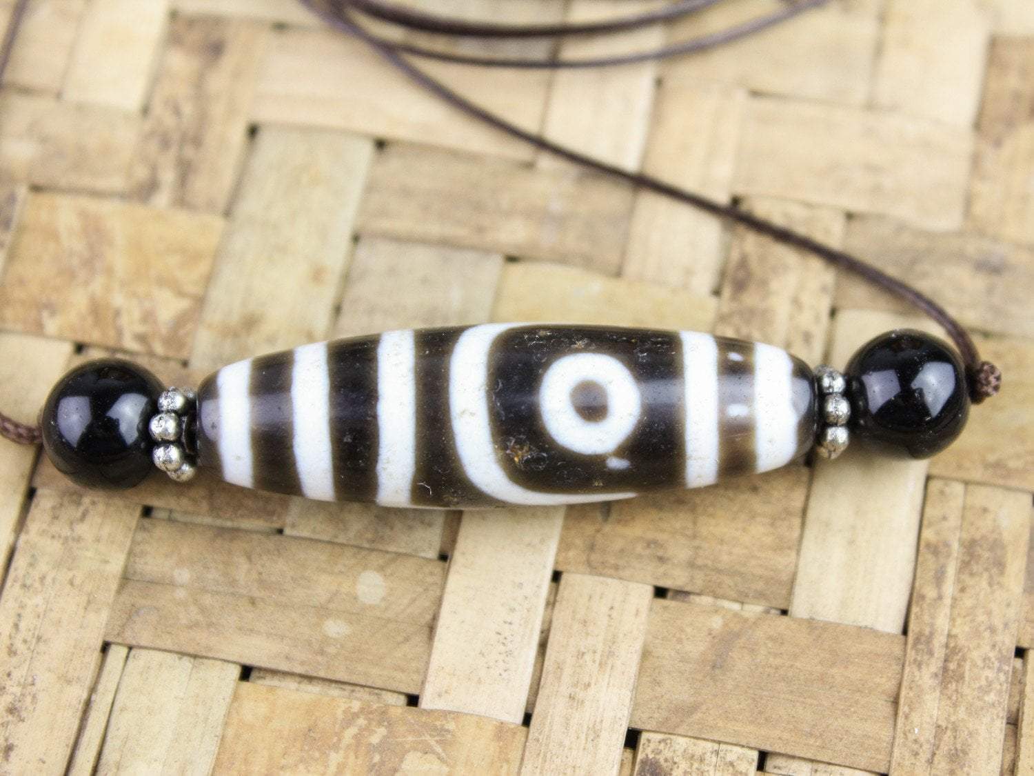 Each necklace is hand strung right here at the DharmaShop with Dzi beads collected in the last 17 yearsfrom Kathmandu, Nepal. As each bead is handmade, size or details may vary marginally - please let us choose. Limited quantity; only three available. Necklace features a double eyed Dzi with onyx accent beads on brown vegan leather cord.