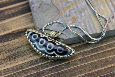 The Dzi bead (pronounced "Zee") is said to provide spiritual benefits and are prized as protective amulets.  This particular dZi bead is in a unique shape and strung on a sterling silver chain.