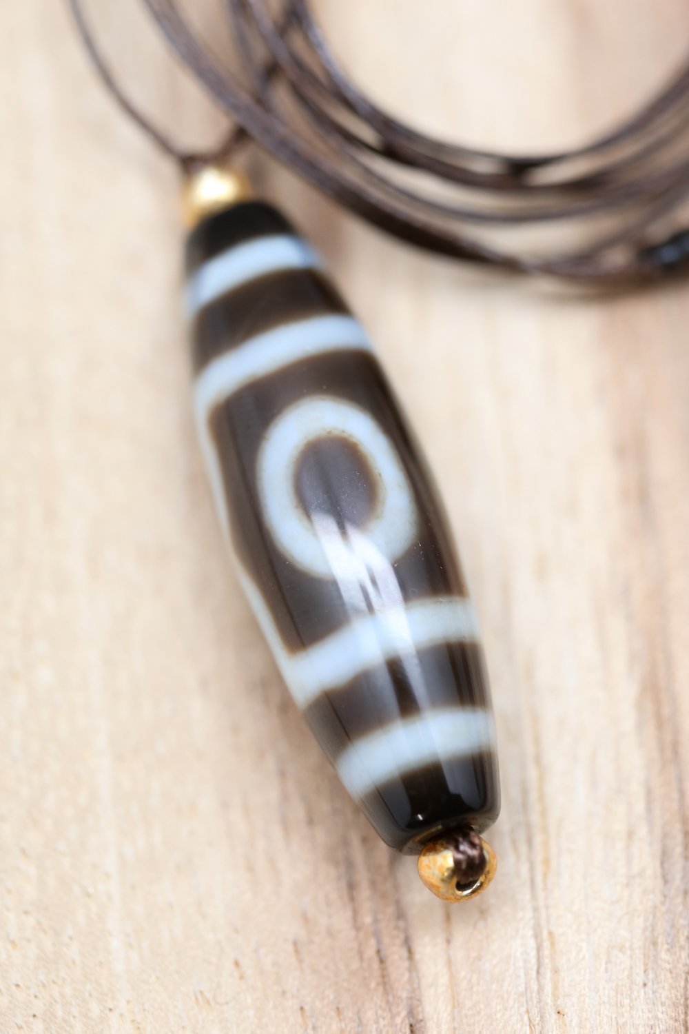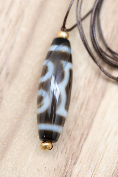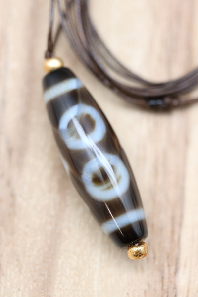 The three eye Dzi bead is said to promote wealth, good health, success, compassion and glory. It also represents the three stars of luck: happiness, honor and longevity.