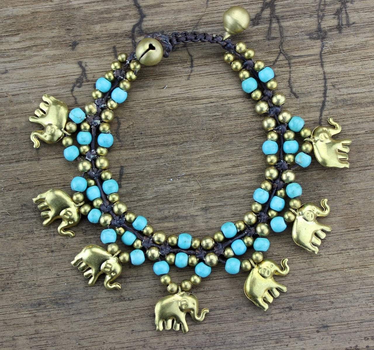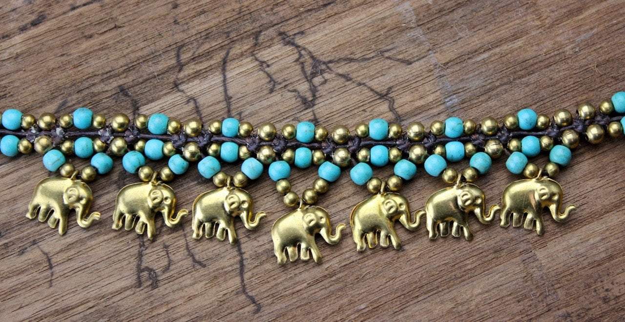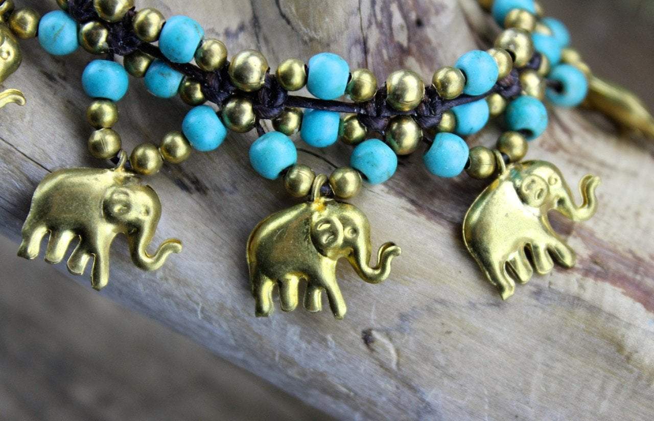 Turquoise bead and brass elephant charm bracelet on wax chord.