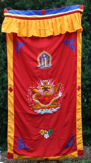 This colorful door curtain is embroidered with a central image of a dragon. The top image is a kalichakra with a dorje at the bottom. All hand embroidered. Size:72H x 38W inches