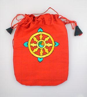 This raw silk bag has the Dharmachakra symbol, one of the 8 auspicious symbols. This bag is hand Embroidered in Nepal by Tibetan artisans.