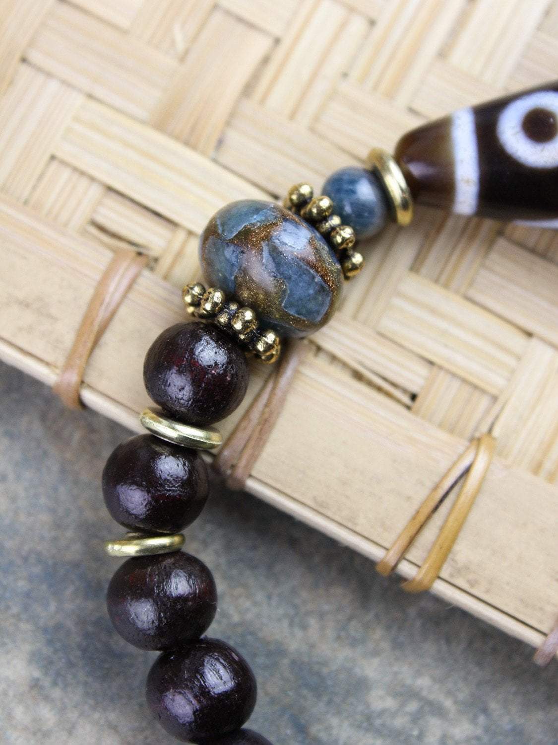 This stylish and unique DharmaShop design includes dark rosewood, gorgeous blue agate beads with gold inclusions, and brass spacers. A 3-eyed, true agate modern Dzi bead centerpiece finishes the bracelet. The 3-eyed Dzi represents the three stars of luck: happiness, honor and longevity. It is the bead of wealth, health, and said to bring continuous fortunes.