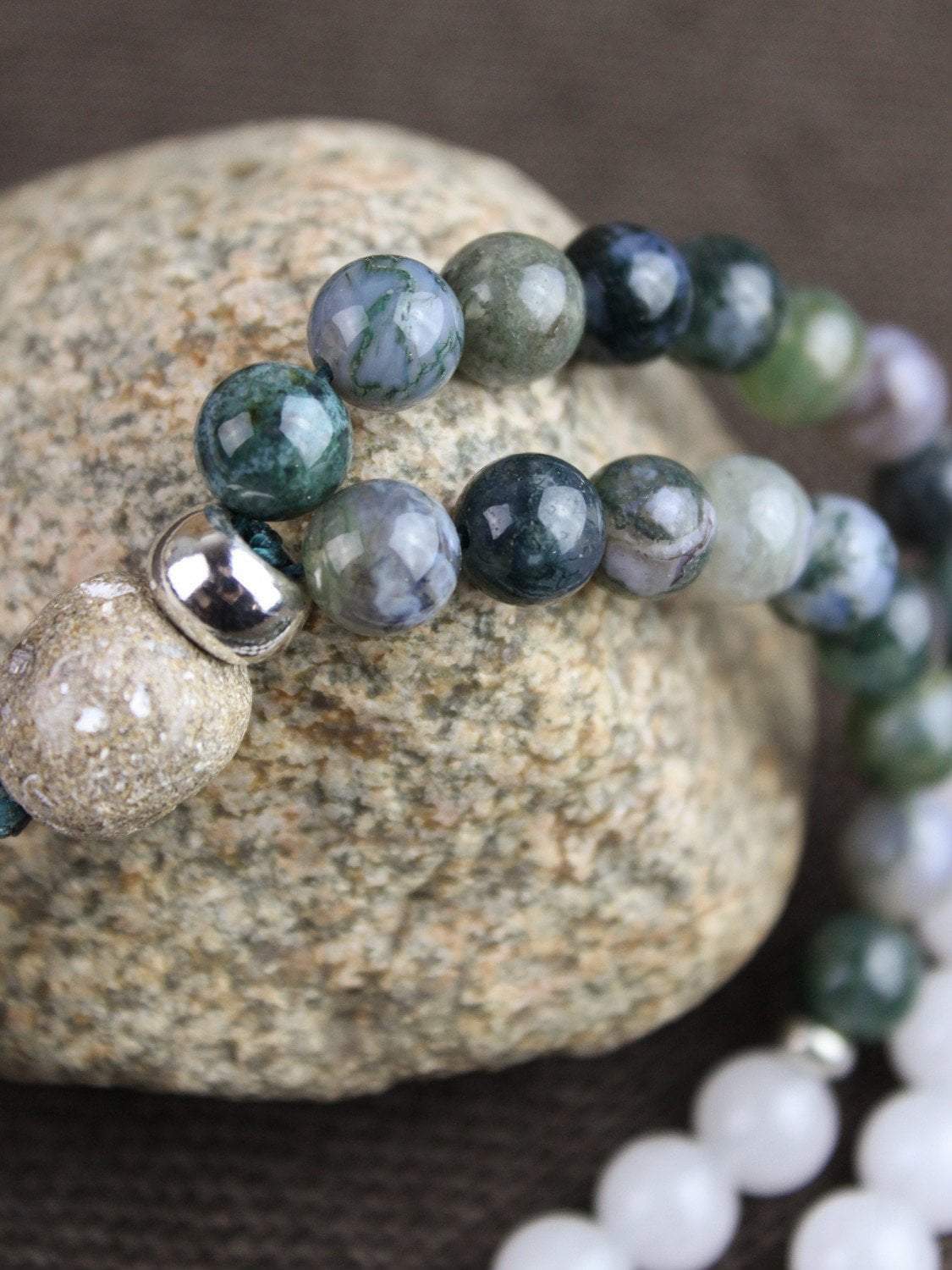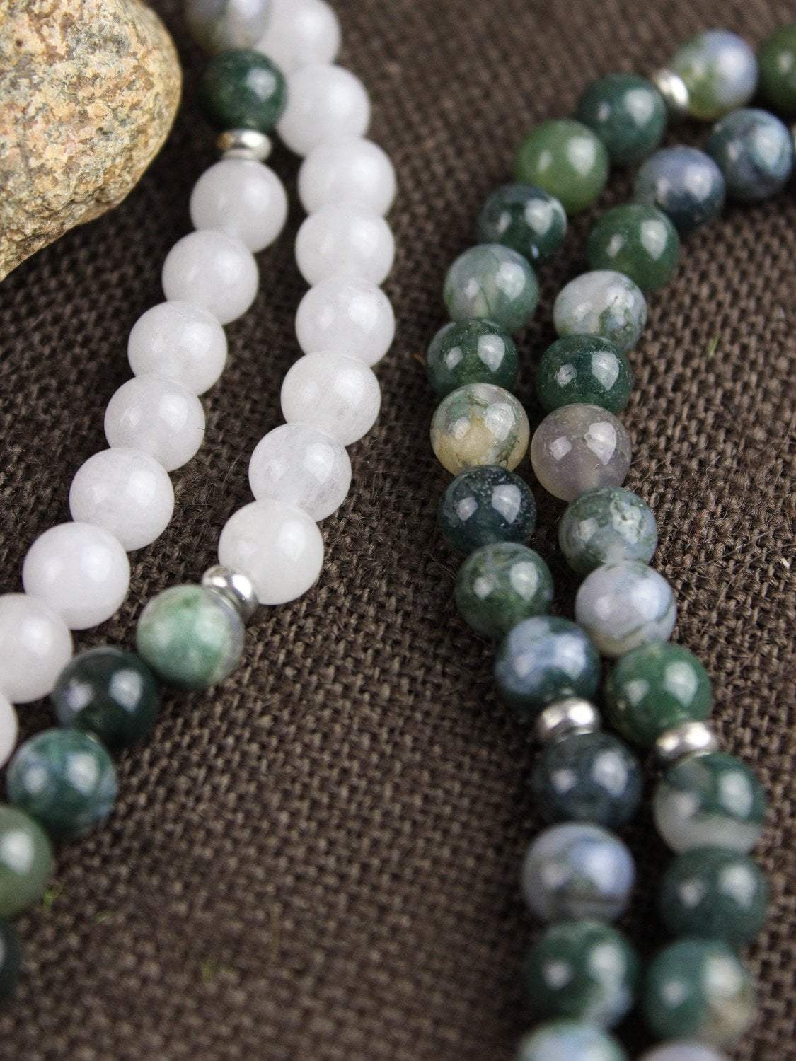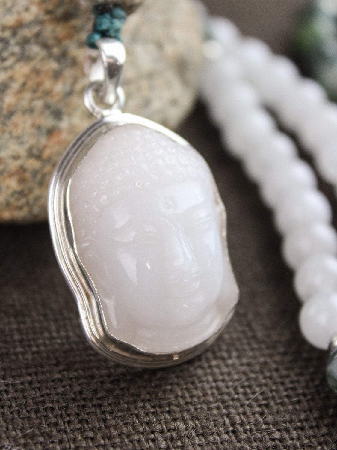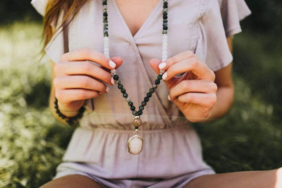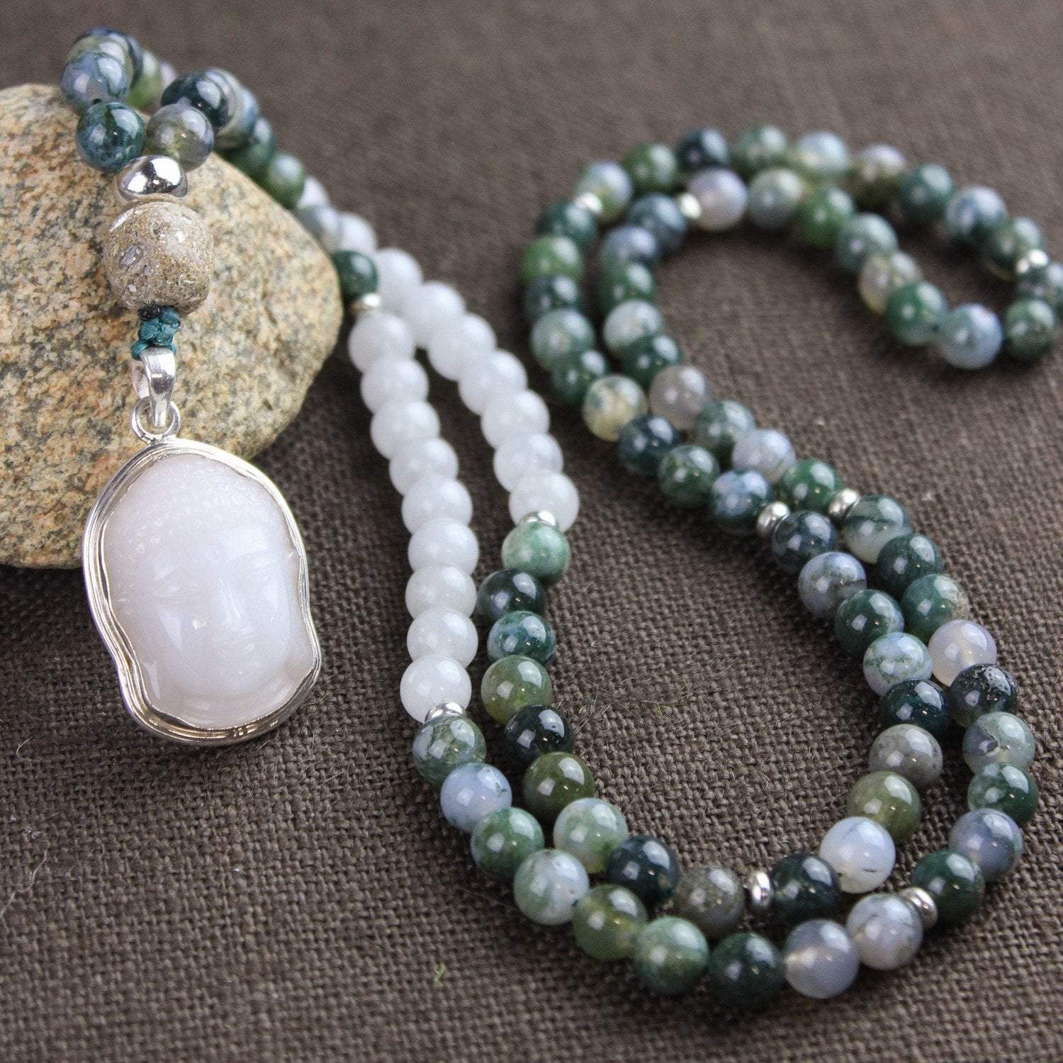 Our exclusive 108 bead DharmaShop mala necklace features a calming and peaceful design. It includes Moss Agate and Snow Quartz beads, a robust Mastodon fossil bead, and a Snow Quartz Buddha pendant. Each Agate bead has its own colorful hue and stone pattern. The pendant consists of a hand carved gemstone that is placed inside of a .925 sterling silver setting with bail.