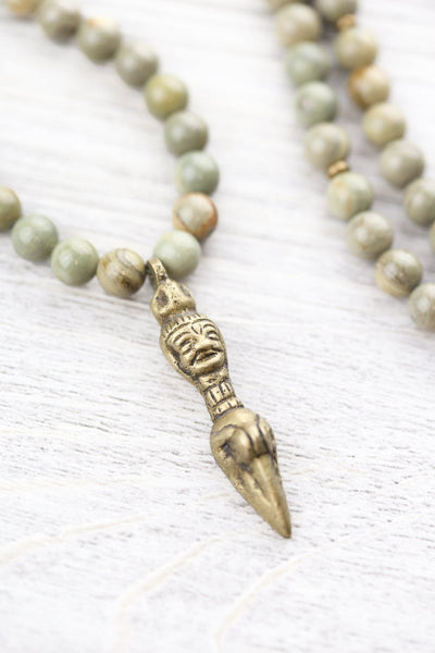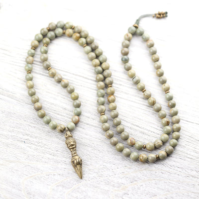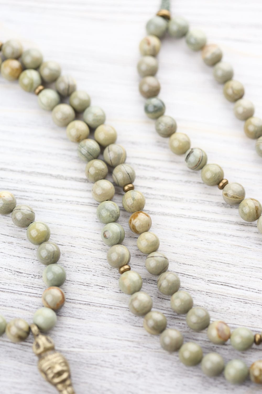 Green Silver Leaf Jasper is a holistic stone used by reiki practitioners. It is believed to awaken its holders to a sense of joy and remind them of their free spirit. Like all jasper, this mala carries a strong connection to the earth's energy and therefore is great for grounding and stability.