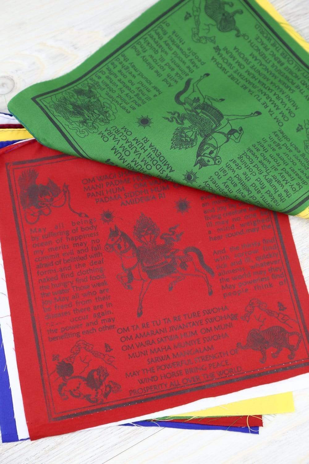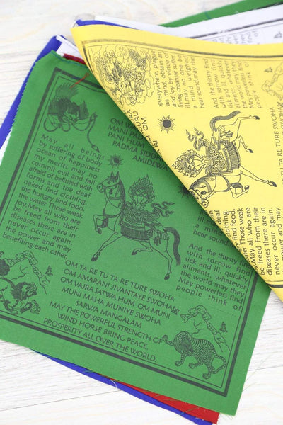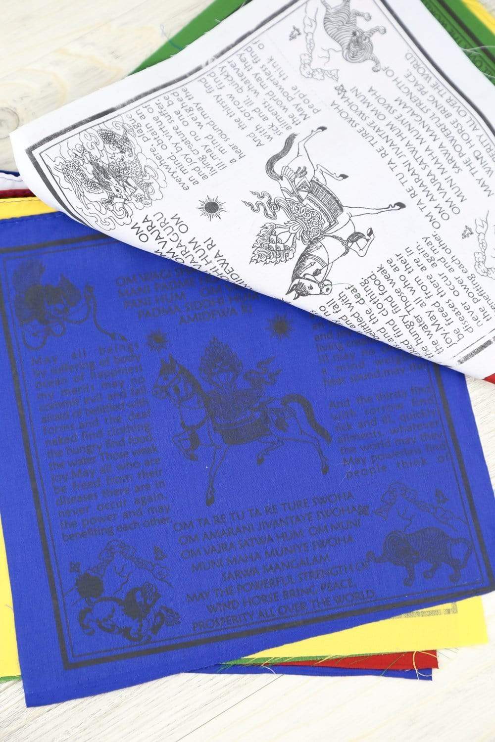 • These flags have the traditional prayers in English and Tibetan transliteration.  Each flag is screen printed by hand in Kathmandu, Nepal.