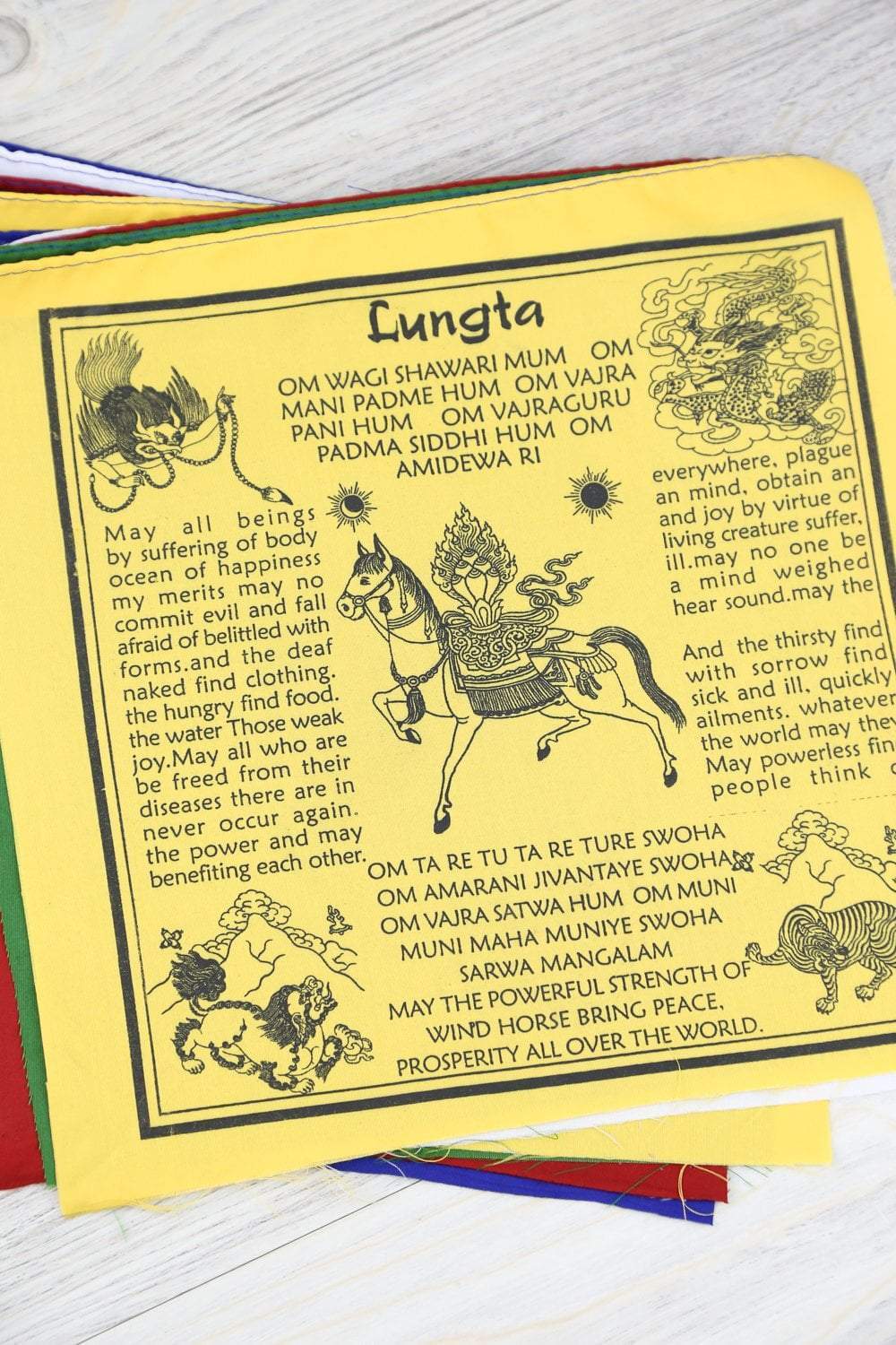 • A large variety of prayers surround the center image of lungta, a Windhorse.  Lungta is also the Tibetan word for 'prayer flag'.