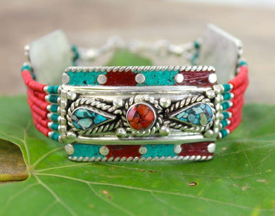 Our enchanting traditional Tibetan style bracelet is back in stock! Handcrafted in Nepal, it features beautiful bead work along with inlaid pieces of turquoise and coral set in silver plated brass.
