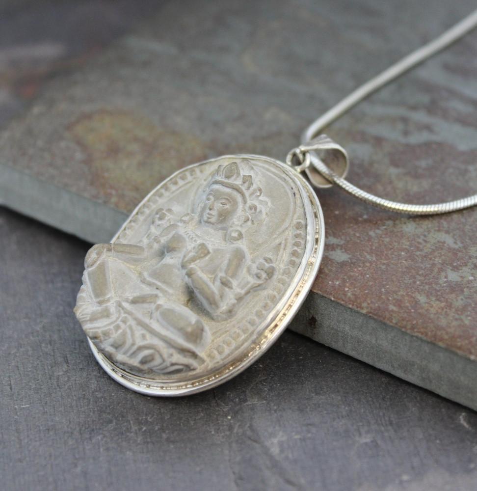 This one of a kind hand carved Tara is set in sterling silver by a Tibetan jewelry artist in Kathmandu Nepal
