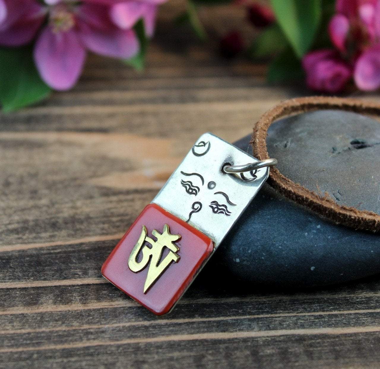 The eyes of Buddha are hand carved in silver with a coral stone that has the Tibetan Om in brass inlaid at the bottom. A pop of wisdom and color.