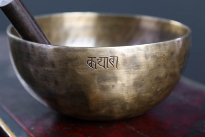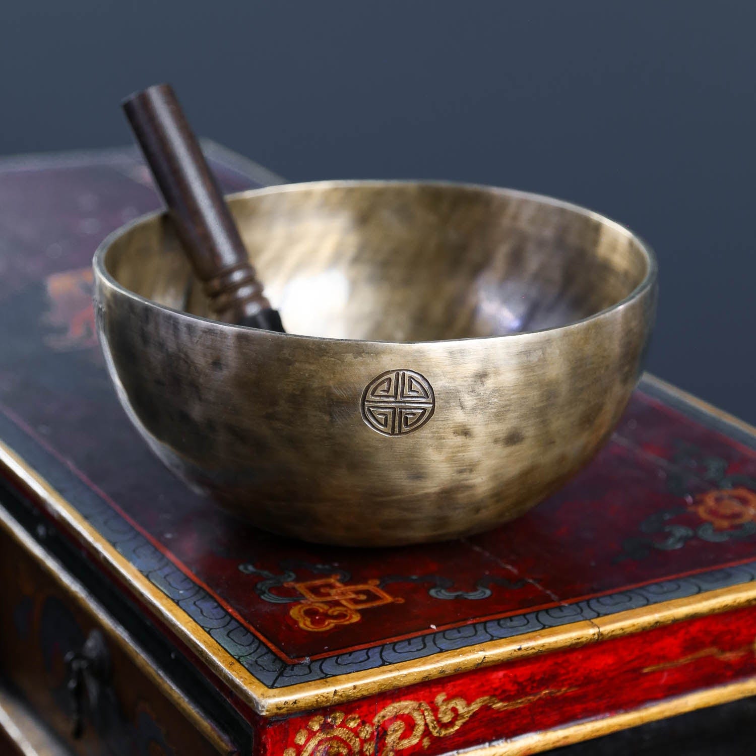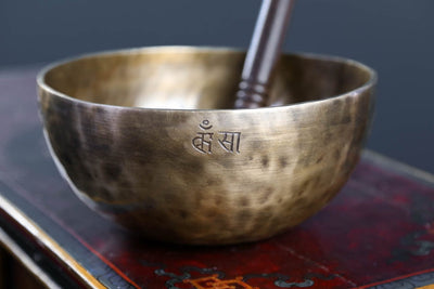 Each bowl features gorgeous hand carved details including an exclusive full moon singing bowl stamp, an original makers mark, and the mantra of compassion in Tibetan script.