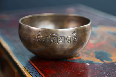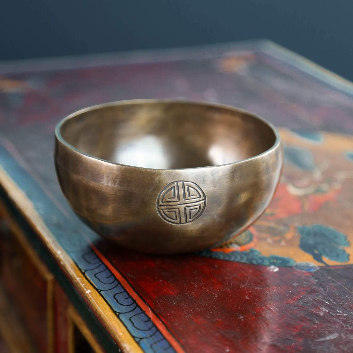 Each bowl features gorgeous hand carved details including an exclusive full moon singing bowl stamp, an original makers mark,  and the mantra of compassion in Tibetan script.  The mantra invokes the powerful benevolent attention and blessings of Chenrezig, the embodiment of compassion.  The full moon singing bowl stamp is also known as the symbol of longevity and happiness.