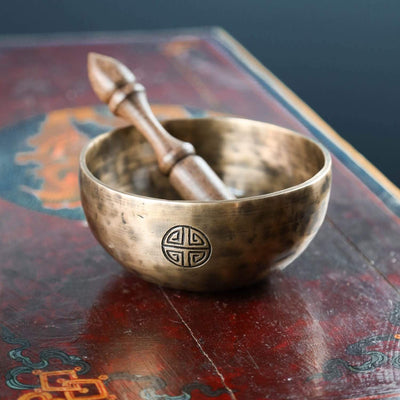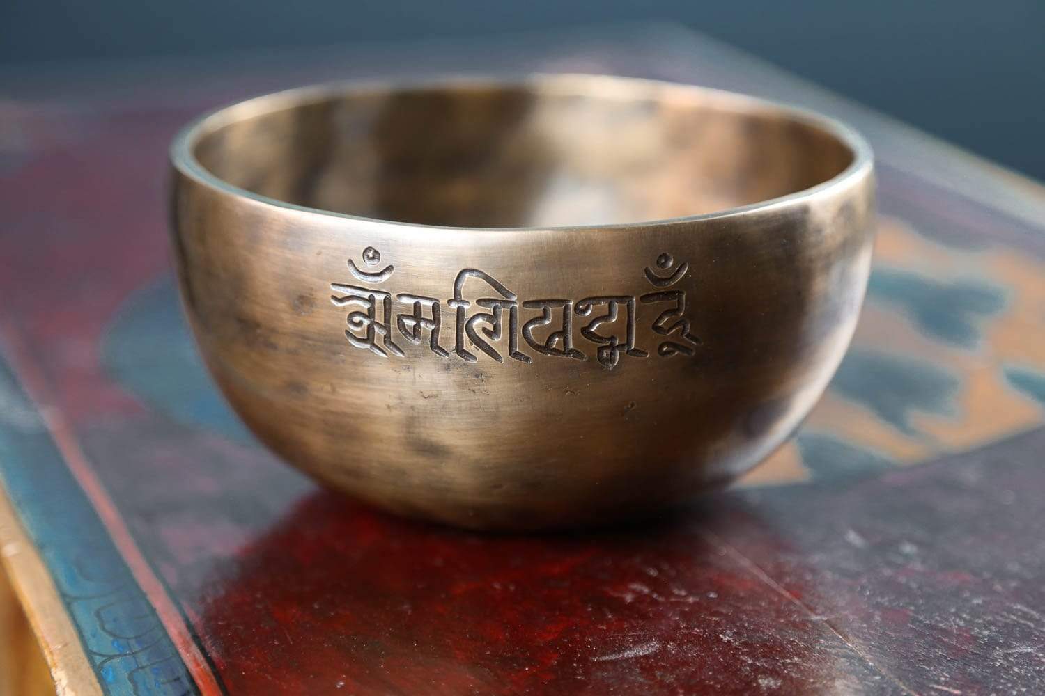 Each bowl features gorgeous hand carved details including an exclusive full moon singing bowl stamp, an original makers mark,  and the mantra of compassion in Tibetan script.  The mantra invokes the powerful benevolent attention and blessings of Chenrezig, the embodiment of compassion.  The full moon singing bowl stamp is also known as the symbol of longevity and happiness.