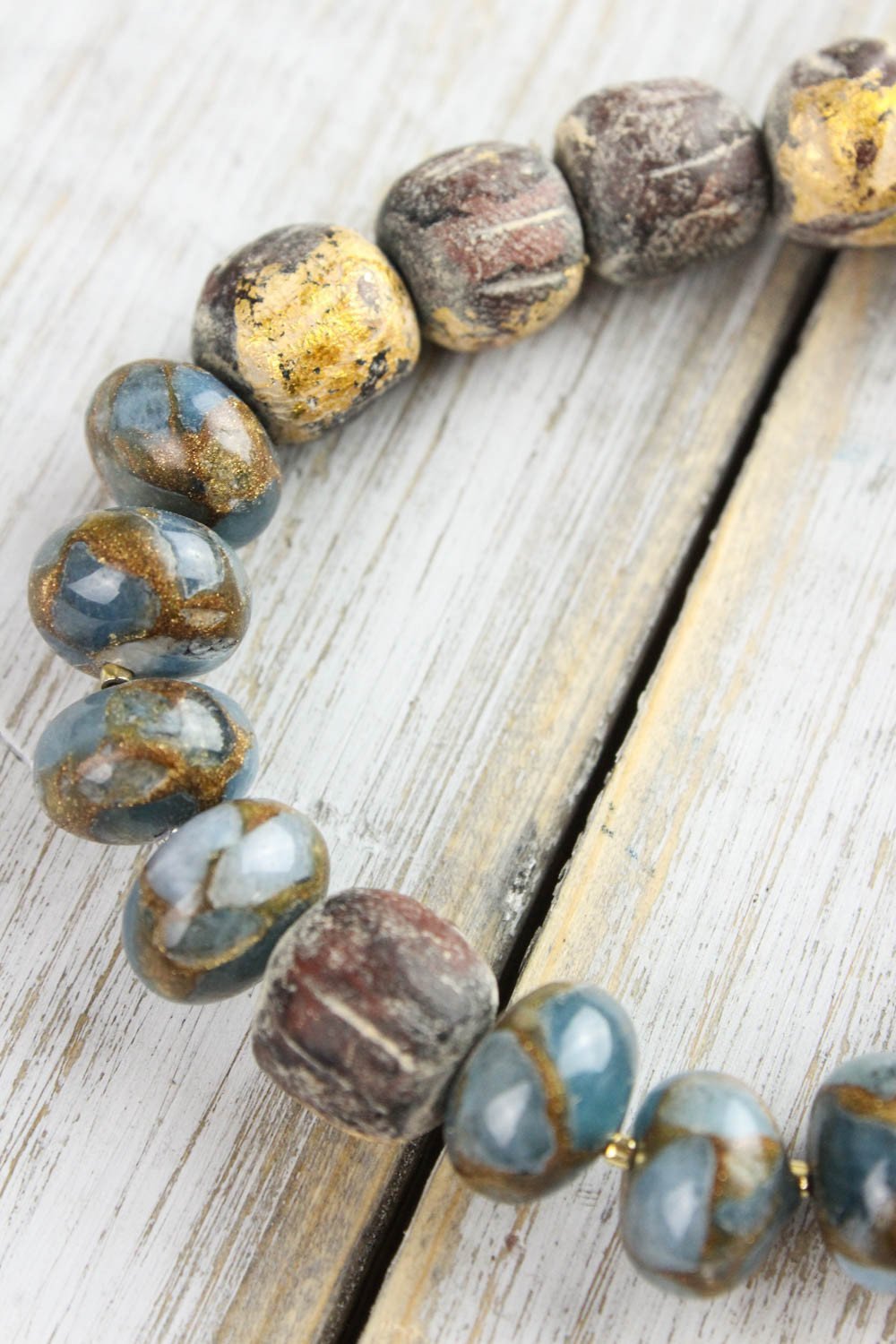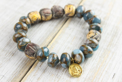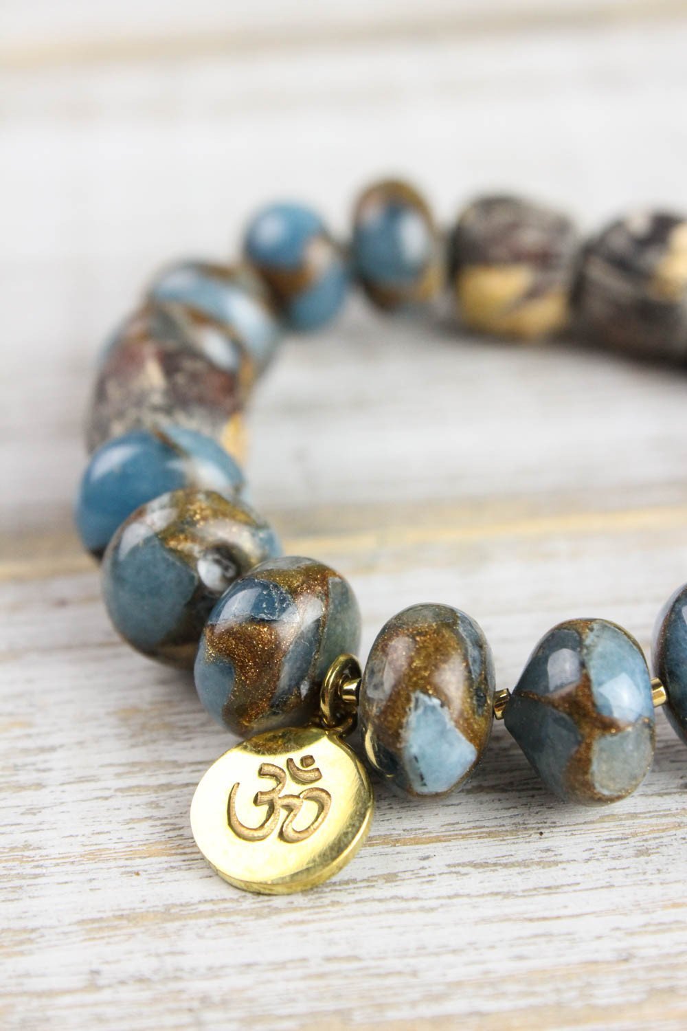 New and exclusive bracelet hand strung with exquisite blue and gold Agate beads, brass spacers, and handmade Thai Buddha beads. Each bead is one-of-a-kind and visually stunning. Metaphysically, agate has a lower intensity and vibrates to a slower frequency than other stones, but is highly regarded as a stabilizing and strengthening influence. It is excellent for balancing emotional, physical and intellectual energy, and in harmonizing yin and yang, the positive and negative forces of the universe.