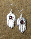 The Downward facing hand is a potent religious symbol in almost all religions. This hand signifying the earth touching mudra is set with garnet stones in sterling silver Size:1 inch tall
