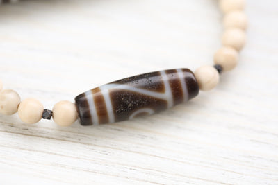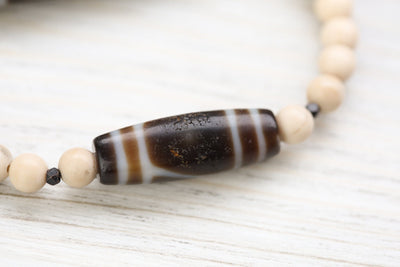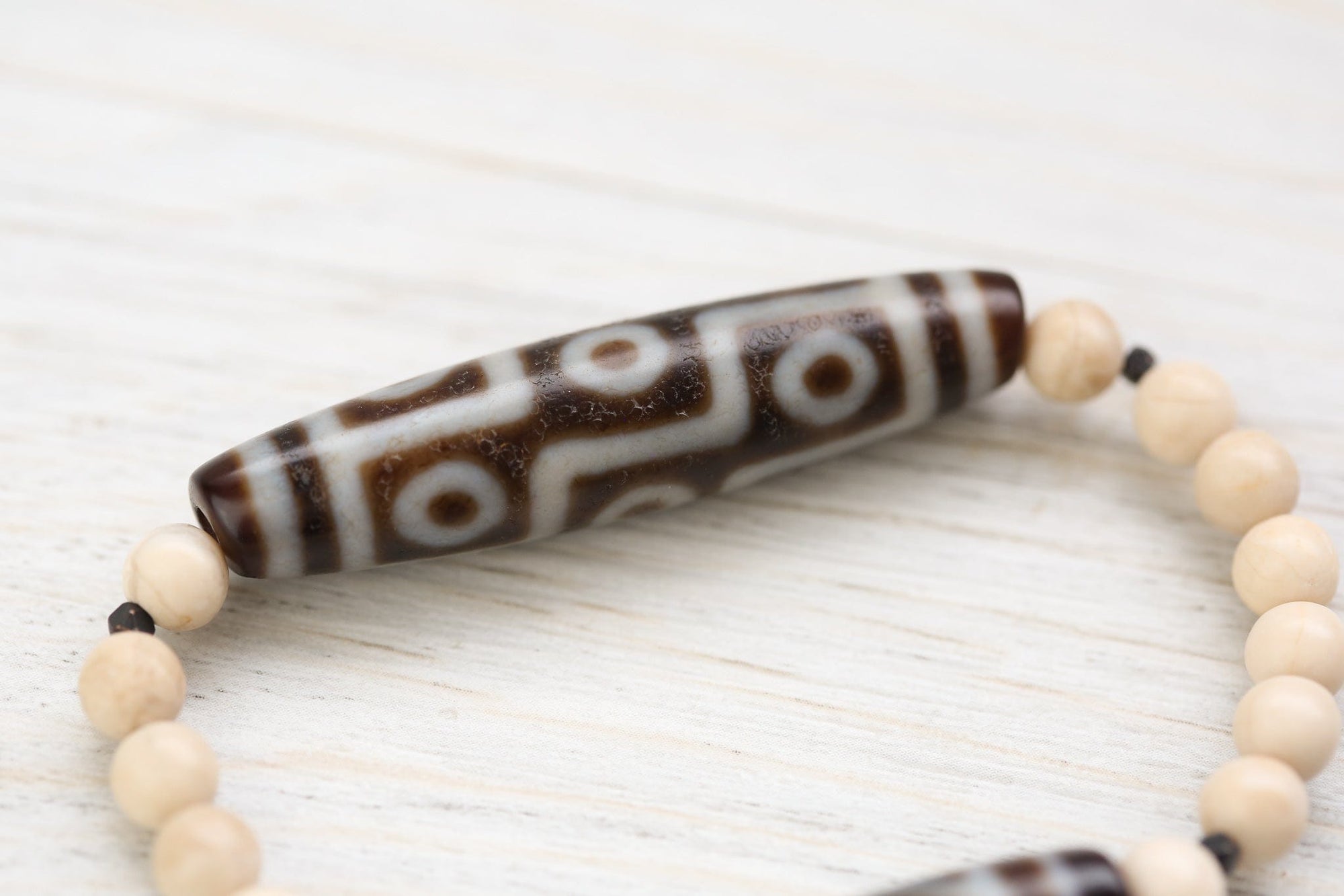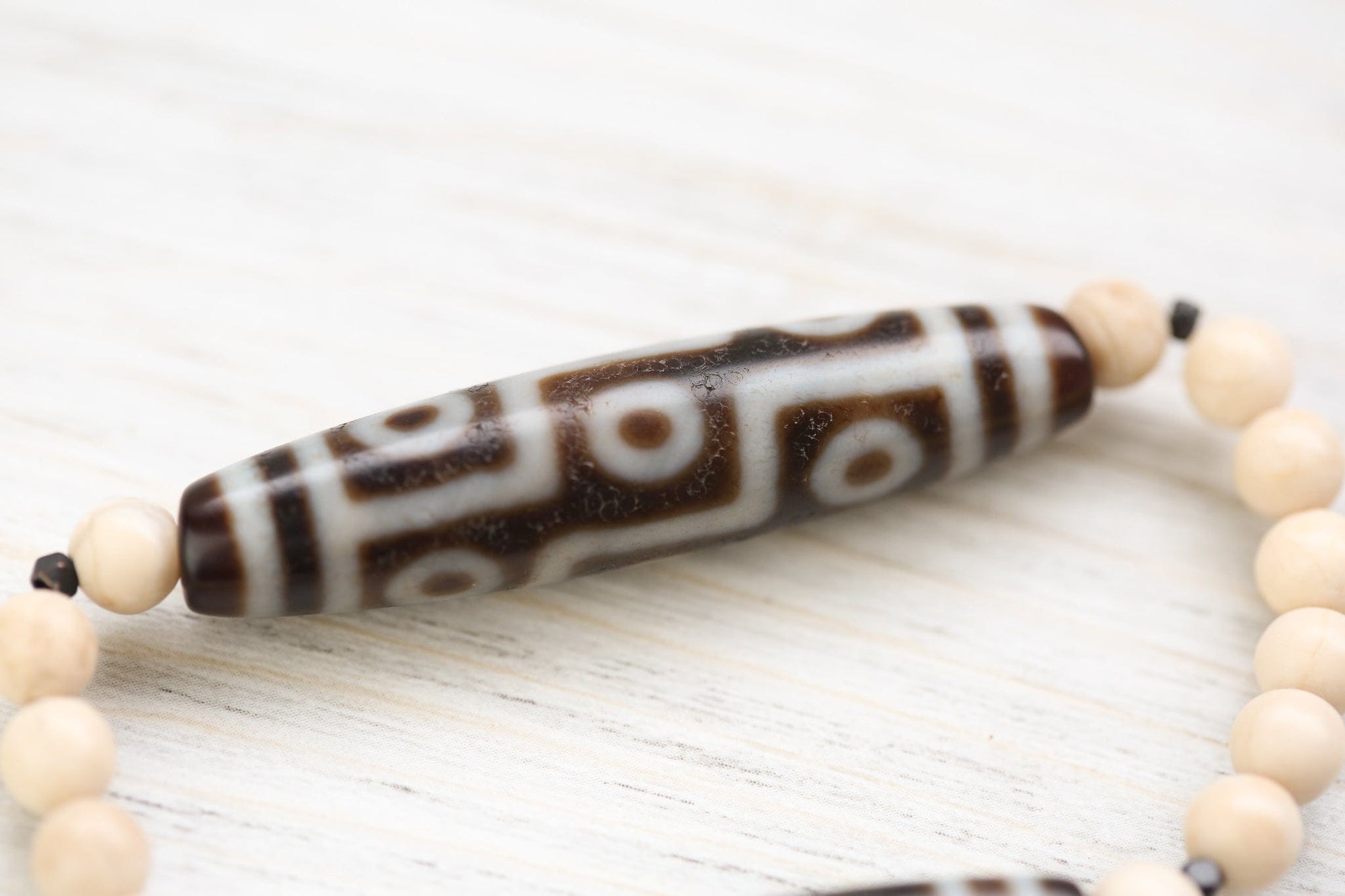 One of the most powerful and sought-after designs in Tibetan culture, the 9-Eye Dzi offers protection, clears karmic obstacles, and attracts nine forms of wealth and good fortune. This particular bead is a newer, true agate Dzi of exceptional quality, comparable in appearance and detail to antique beads. It represents the nine planetary systems and their astrological essence.