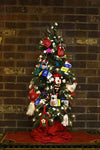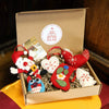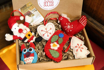 Your ornament gift box includes... A holiday tree, white heart, blue owl, red stocking, red hen, and Santa!