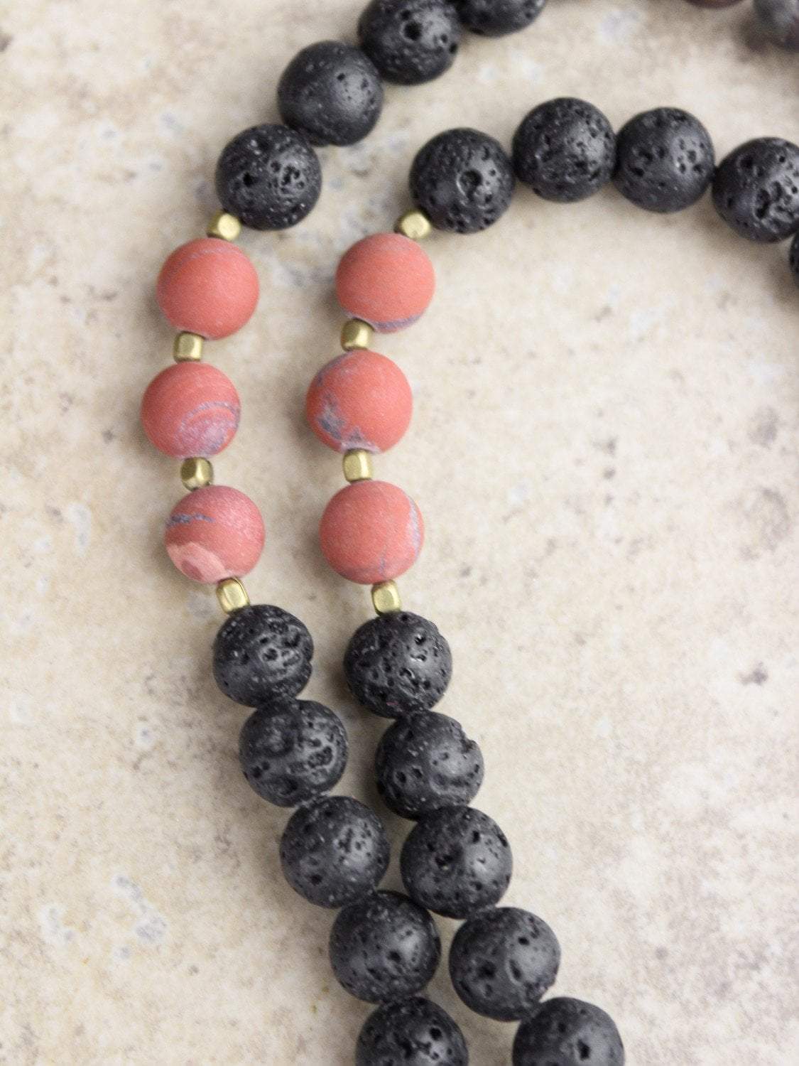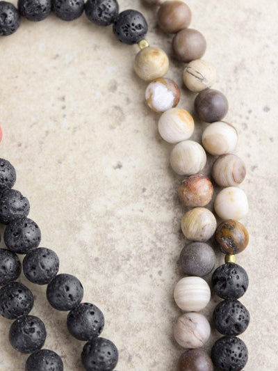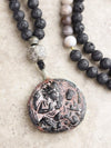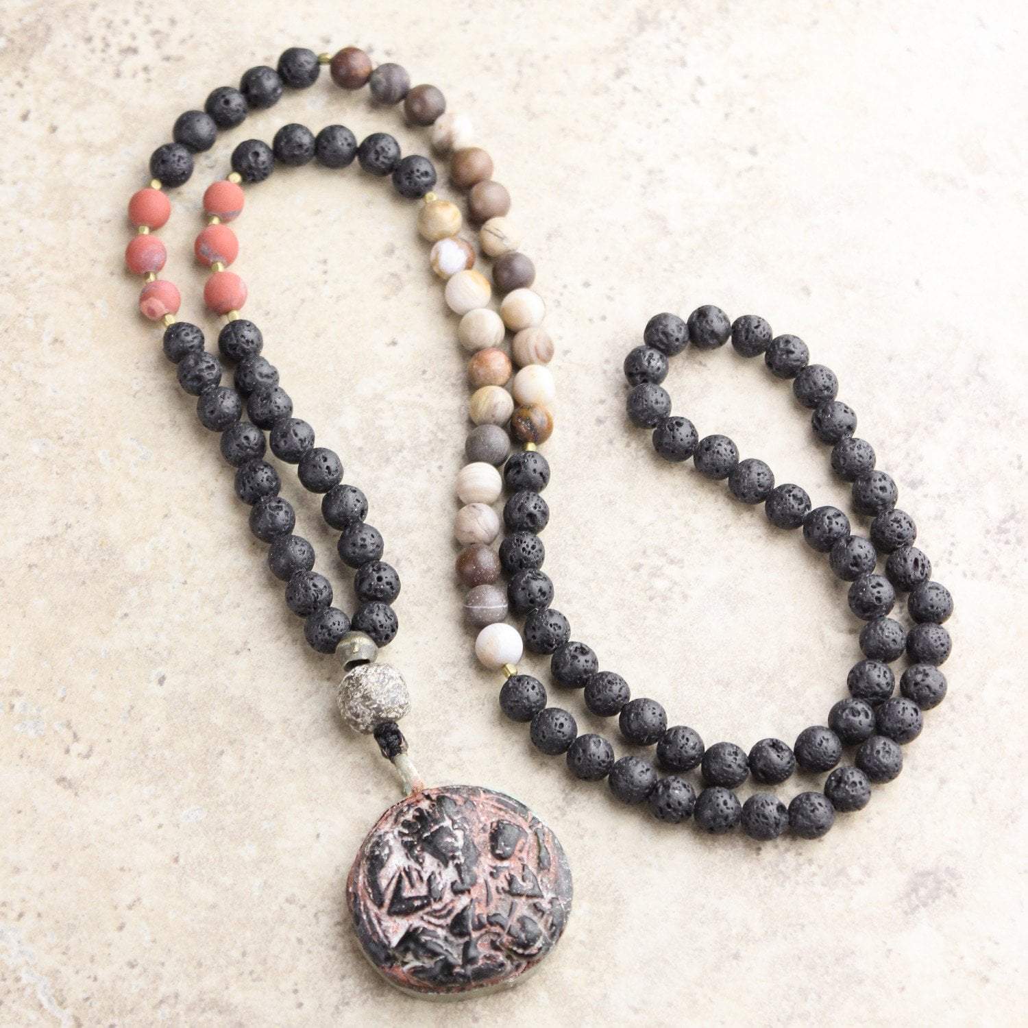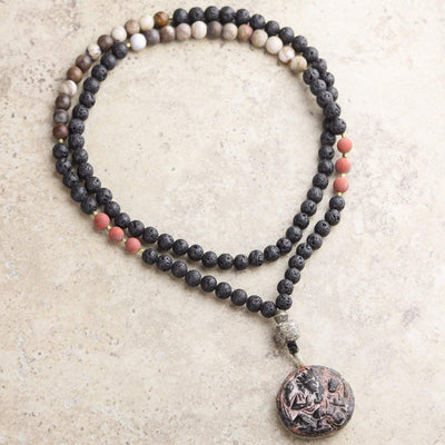 Another beautiful DharmaShop exclusive design that features 108 beads including lava rock, matte red jasper, and polished fancy jasper beads. A prehistoric mastodon bead hangs from the center of the mala along with an authentic handmade glass Ganesh pendant from Thailand. One of the most well-known and worshipped deities, Ganesh is known as the remover of obstacles, the patron of arts and sciences, and the deity of intellect and wisdom.