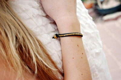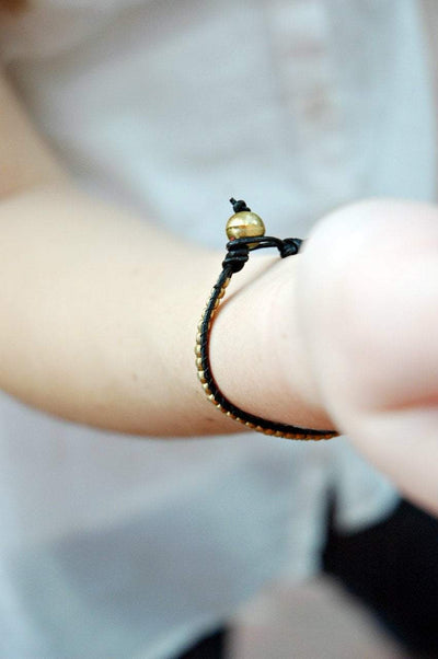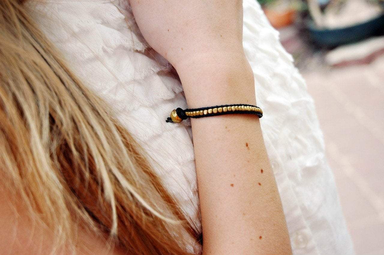 Leather and gold color beaded bracelet. Hand made in Kathmandu Nepal.