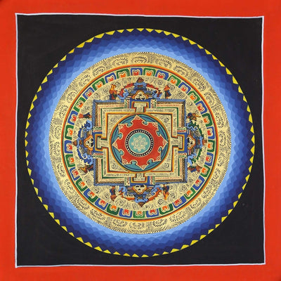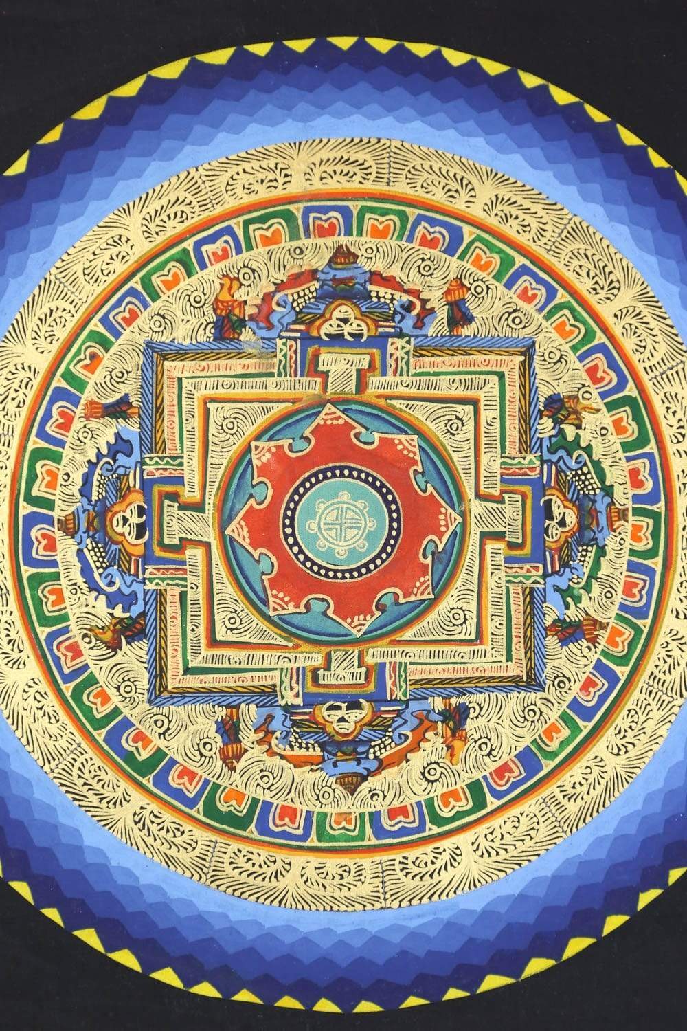 This thangka features a blue lotus petal ring with golden mandala designs and the Dharma Wheel in the center. The Dharma Wheel is one of the Eight Auspicious Symbols and also one of the oldest symbols in Buddhism. It is a symbol of rebirth and awakening, and represents the turning wheel of Buddha's teachings.