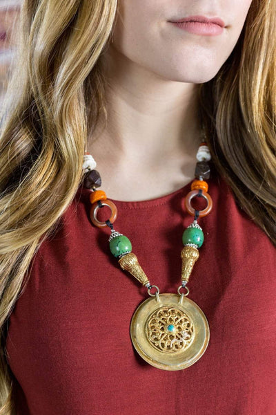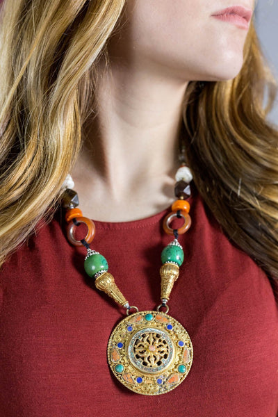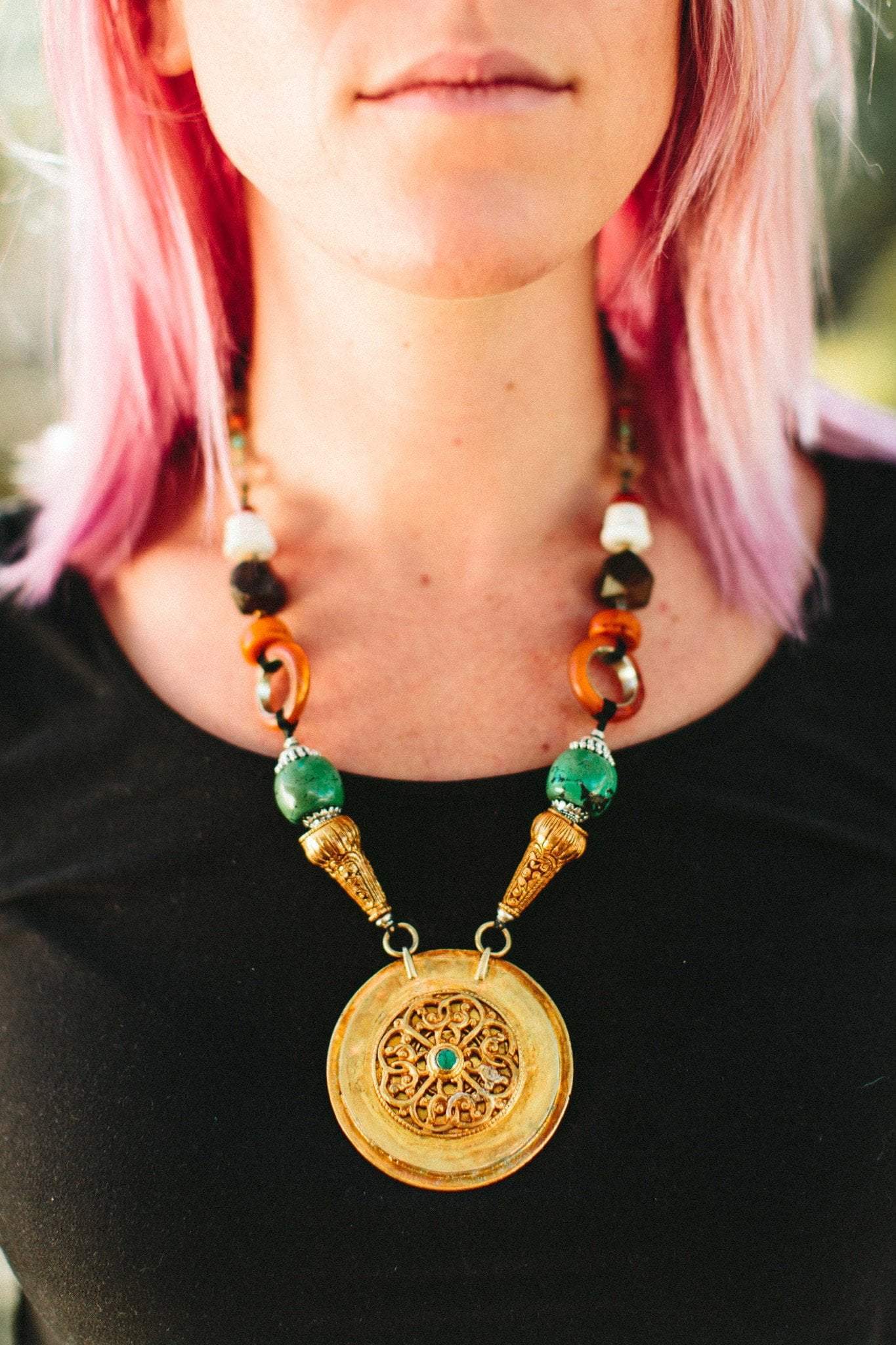 Our spring collection from Tibetan jewelry artist Karma Dolma is here! Each necklace was hand picked from Karma and is handmade in Kathmandu Nepal by 3rd and 4th generation jewelry artists. This particular necklace is simply stunning. Featuring a gold center medallion with a hand etched double dorje design, this necklace is one of a kind. Strung with a variety of large Tibetan beads.
