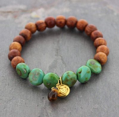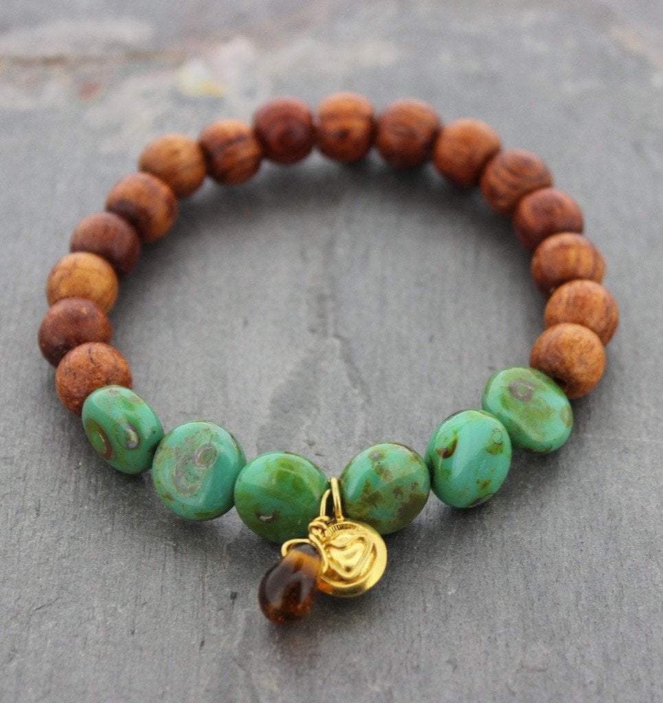 Our newest wrist mala features a tiny heart charm and wrapped amber bead surrounded by handmade glass Czech beads and Thai Oiled Datewood.