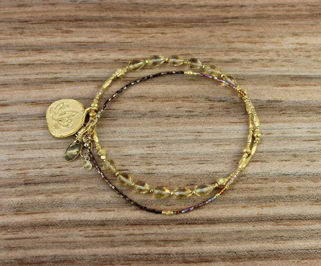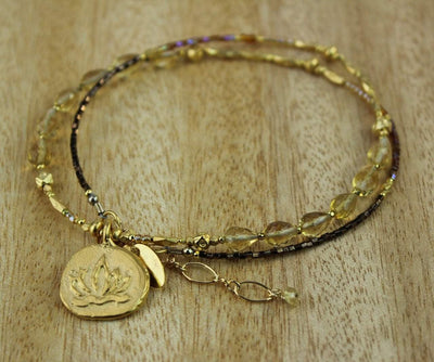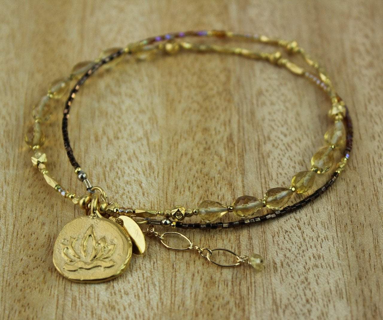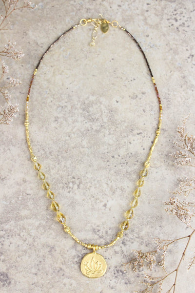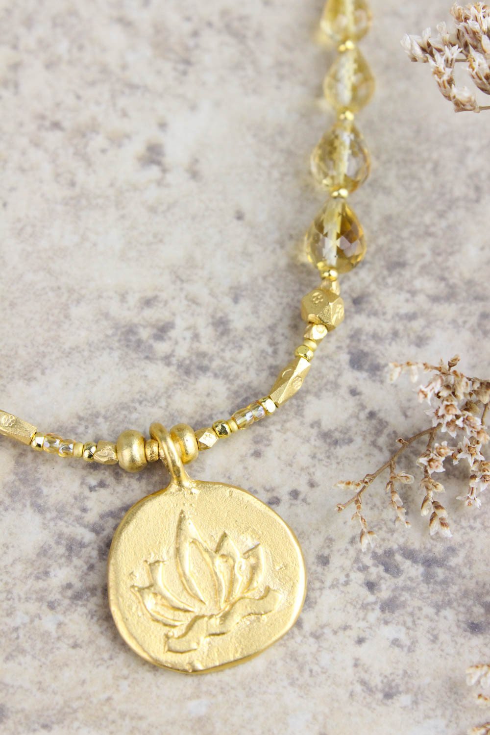 Delicate yellow garnets and tiny gold beads surround a beautiful gold vermeil Lotus pendant. Handmade in the USA. Gold hook closure.