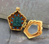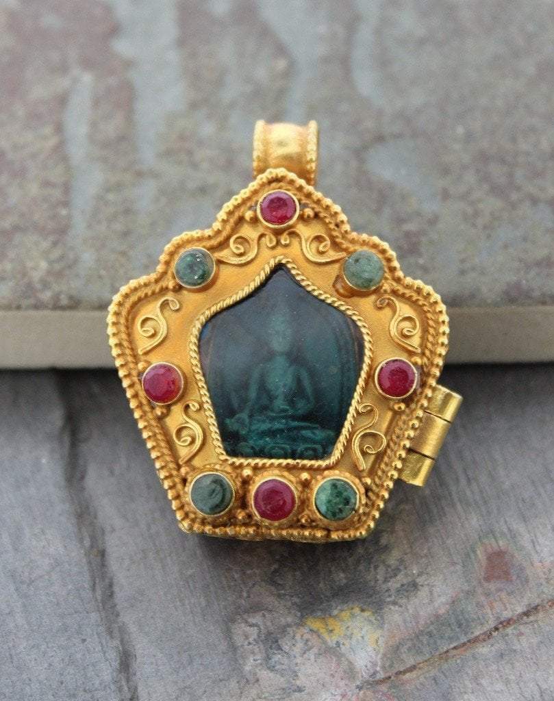 This cool Tibetan locket is gold plated sterling silver with delicate filagree designs and a pressed turquoise Buddha statue inside. Surrounding beads are turquoise, coral, and carnelian.