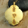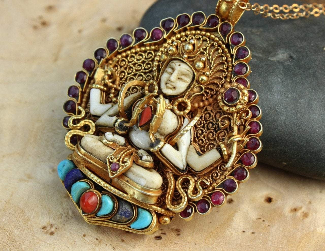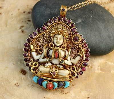 A brilliant one of a kind Chenrezig pendant with real rubies, coral and lapis stones set inside this gold plated beauty. Chenrezig is carved out of bone. Om an hum is inscribed on the back; the mantra of blessings. Hand made with care in Nepal.