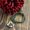 This simply stunning Hill Tribe silver flower pendant is stung on sage green suede cord, and shows the exquisite talent of the Karen Hill Tribe in Northern Thailand. A very high silver count (.98) makes this a nearly white silver.