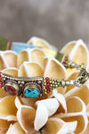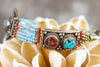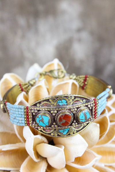 Hand inlaid pieces of turquoise and carnelian decorate this one-of-a-kind Tibetan style brass bracelet. Turquoise is the symbol of friendship and is a very personal and meaningful stone to anyone who wears it. It carries great wisdom of basic truth within it. Turquoise is said to open up all chakras. Carnelian captivates, and brings a rush of warmth and joy that lingers. Known as a stone of motivation and endurance, leadership and courage, Carnelians have protected and inspired throughout history.
